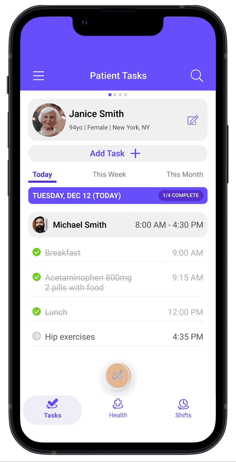Healthcare isn't just about scheduled tasks and medications. Some of the most important information comes from noticing changes in daily life – a sudden energy dip, unusual behavior, an unexpected symptom, or an as-needed medication dose. The gold button makes it effortless to capture these crucial observations before they're forgotten.